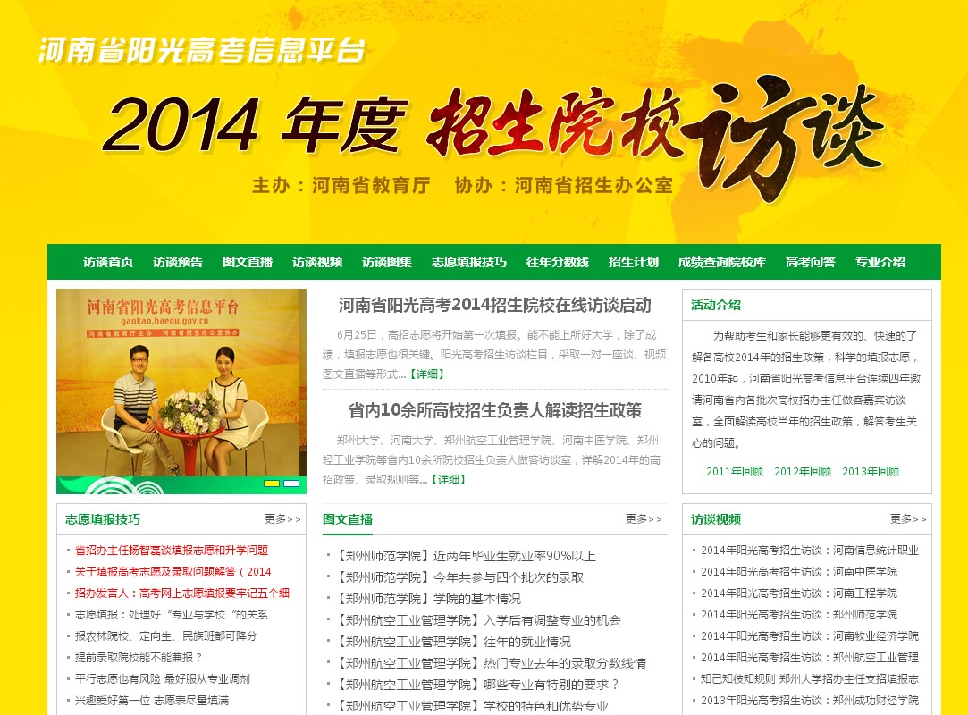 6月25日,高招志愿将开始第一次填报。能不能上所好大学,除了成绩,填报志愿也很关键。为给广大考生提供更多资讯参考,6月18日至20日期间,省阳光高考信息平台()邀请郑州大学、河南大学、郑州航空工业管理学院、河南中医学院、郑州轻工业学院等省内10余所院校招生负责人做客访谈室,详解2014年的高招政策、录取规则等。访谈采取一对一座谈、视频图文直播等形式,请考生关注j9九游会登陆入口访谈专题。