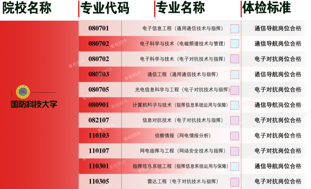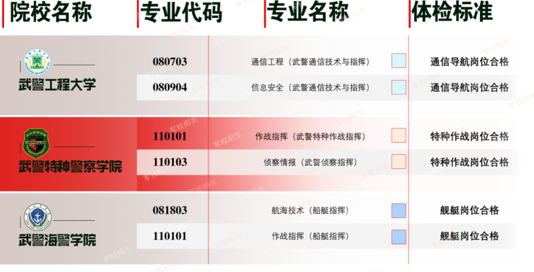 新体检标准涉及军校招生的内容共分两个部分,分别是通用标准和选拔军官补充标准,特种作战、通信导航、电子对抗、防化、机降、伞降、医疗卫生、舰艇、潜艇、潜水、装甲、油料、测绘、导弹等特殊岗位的招生专业,在符合通用标准的基础上,还须达到相应的补充标准。除下表所列招生专业外,其余专业均执行通用标准。